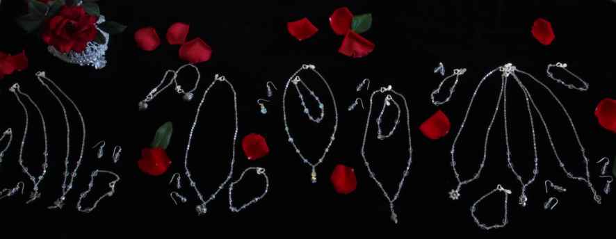 All custom length necklaces with matching earrings and bracelets with sterling silver chain and sterling silver plated findings. Bride and Mother of the Bride includes Swarovski crystals. Bridesmaids, Mother of the Groom, and Sister includes fire-polished glass. Flower girls and Mother of the Bride includes a "Prayers and Wishes" pewter box.